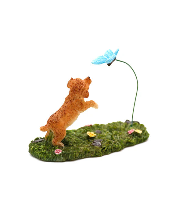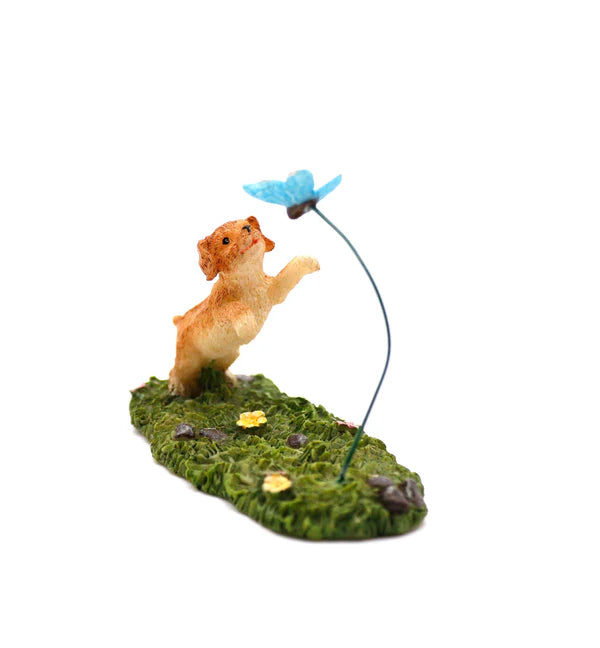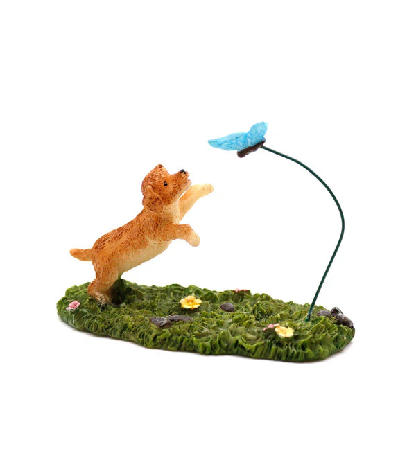 Fairies have pets too! This little puppy chasing a butterfly adds a touch of personality to any fairy garden.